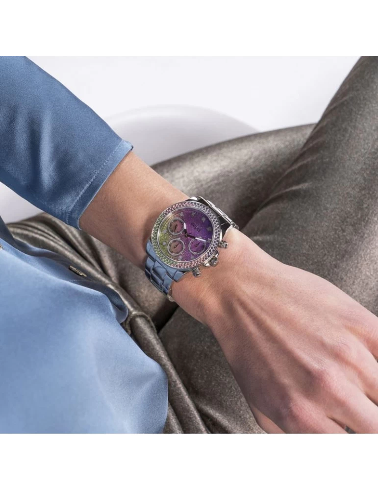 La montre Sol est en acier. La lunette est pavée de cristaux mulicolores et le cadran retrouve un dégradé de paillettes dans des tons violet et vert. Son bracelet en maillons est doté d’une boucle déployante. Taille du boîtier: 38mm.