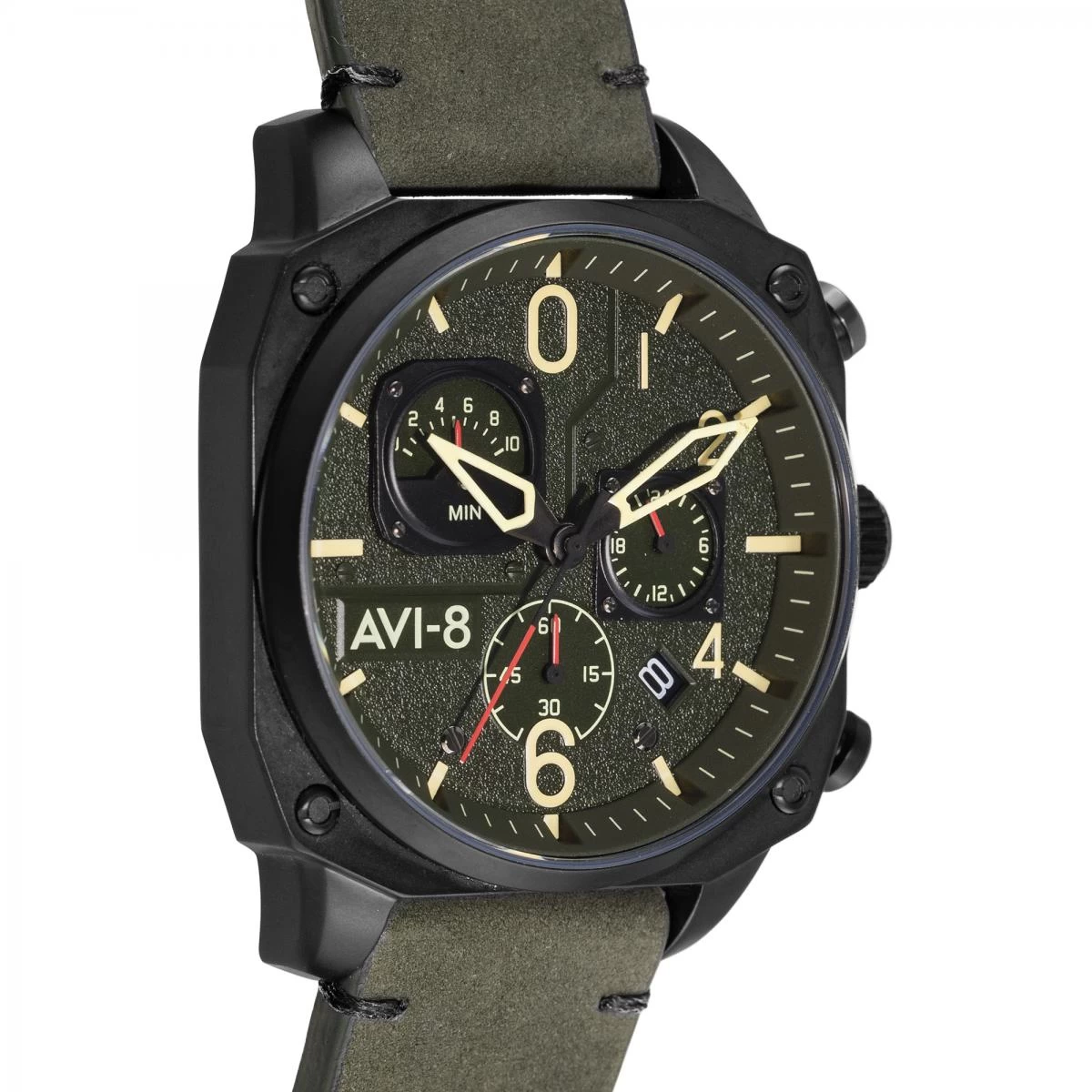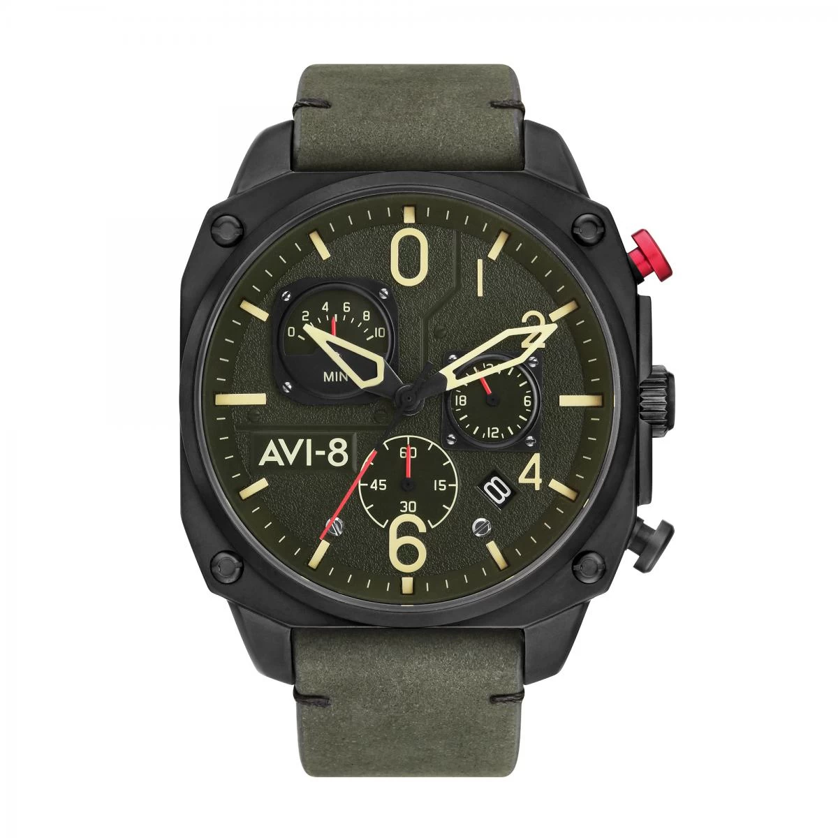 AVI-8 – Hawker Hunter – AV-4052-08 – Montre homme – Mouvement Quartz Japonais Chronographe avec 10 minutes rétrograde et date – Boitier rond en acier noir – Cadran vert – Bracelet vert en cuir véritable.