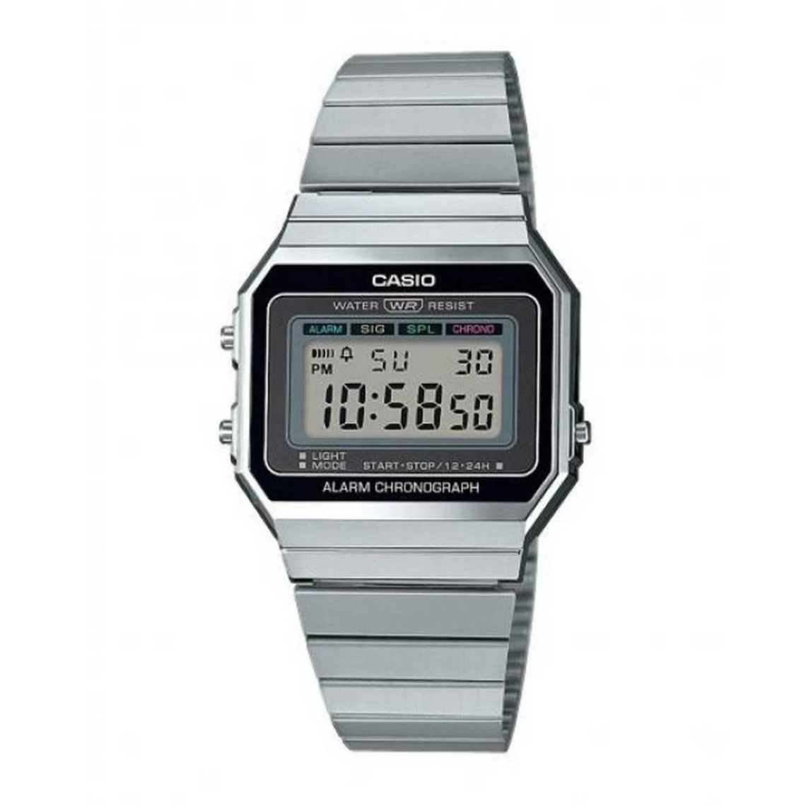 Une diode électroluminescente (DEL) est utilisée pour éclairer le cadran de la montre. Le temps écoulé, les temps partiels et le temps final sont mesurés au centième de seconde près. La montre a la capacité de chronométrer jusqu’à une heure. L’alarme quotidienne émet un signal sonore à l’heure programmée pour rappeler les événements répétés quotidiennement. Une fois défini le calendrier automatique affiche toujours la date correcte. Les heures sont affichées au format 12 ou 24 heures. Robuste, résistant et élégant, le bracelet en acier inoxydable est déjà un classique. La fermeture peut-être ajustée individuellement de manière simple pour offrir un maximum confort. Enfin la pile fournit à la montre l’énergie nécessaire pendant environ 3 ans.