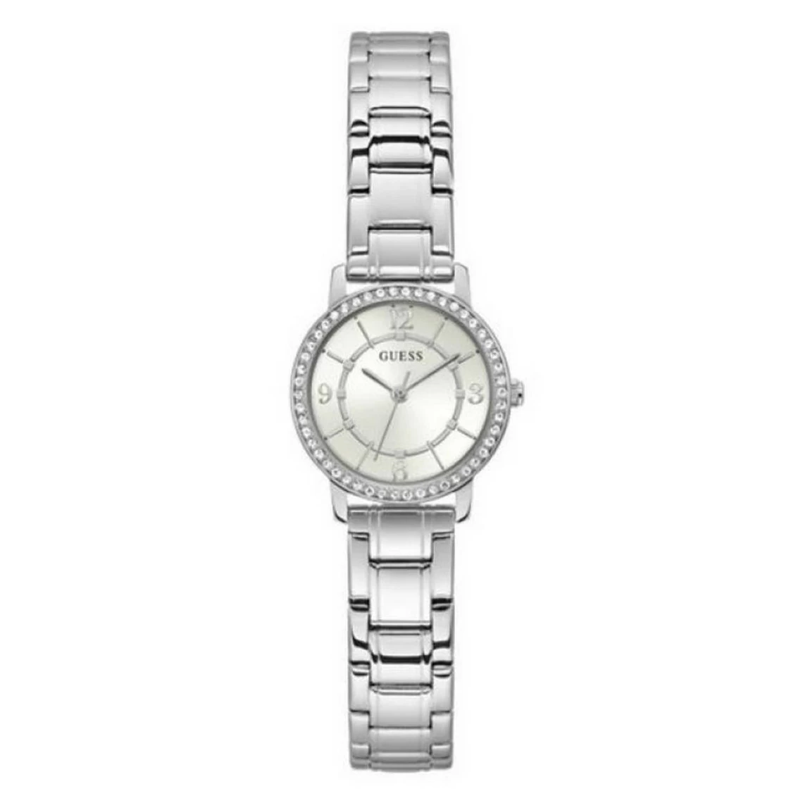 On adore le charme et l’éclat de cette Montre Femme Guess LADIES DRESS GW0468L1 – Bracelet Acier Argent. Elle possède un boĂ®tier rond dotĂ© d’une lunette sertie de strass et un cadran Ă trois aiguilles arborant des index en bâtonnet et des chiffres arabes.