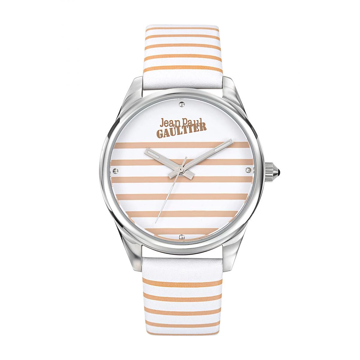 Votre poignet sera resplendissant avec cette Montre femme Jean Paul Gaultier 8502424. Son bracelet en cuir, agrémenté de rayures beiges, porte un boîtier rond en acier poli. Son cadran esprit marinière offre un affichage analogique.