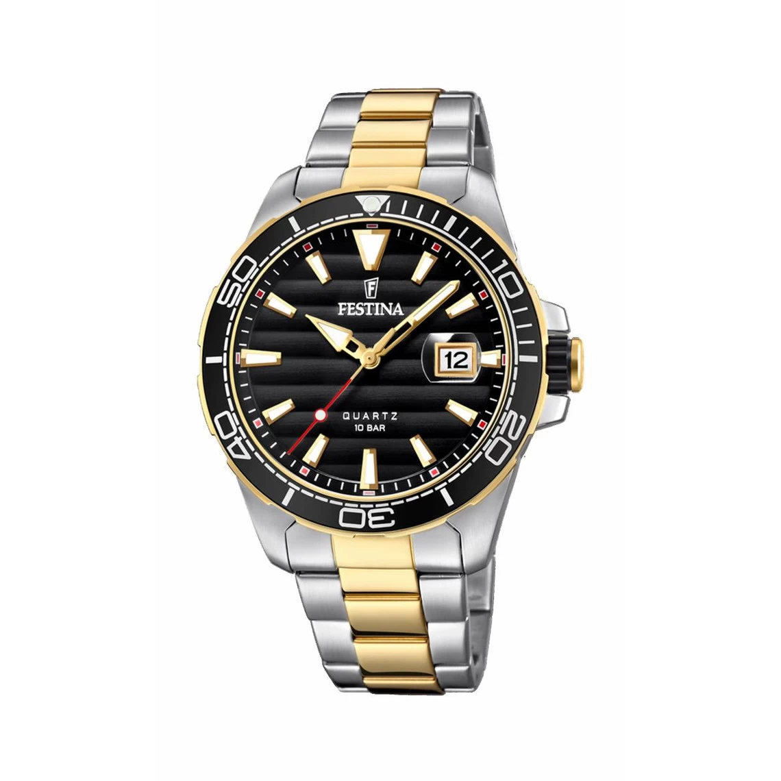 Des finitions innovantes accompagnées d’une ligne tendance, la dernière collection de montre Festina pour homme est splendide. La montre FESTINA F20362-2 se compose d’un bracelet en acier inoxydable bicolore de couleur argenté et doré. Elle dispose de la fonction dateur et détient une étanchéité de 100 m (10 ATM). Son cadran au fond noir laisse apparaître des aiguilles et index de couleur or. Une montre qui deviendra vite un indispensable de votre garde robe et que vous pourrez porter dans toutes les situations.