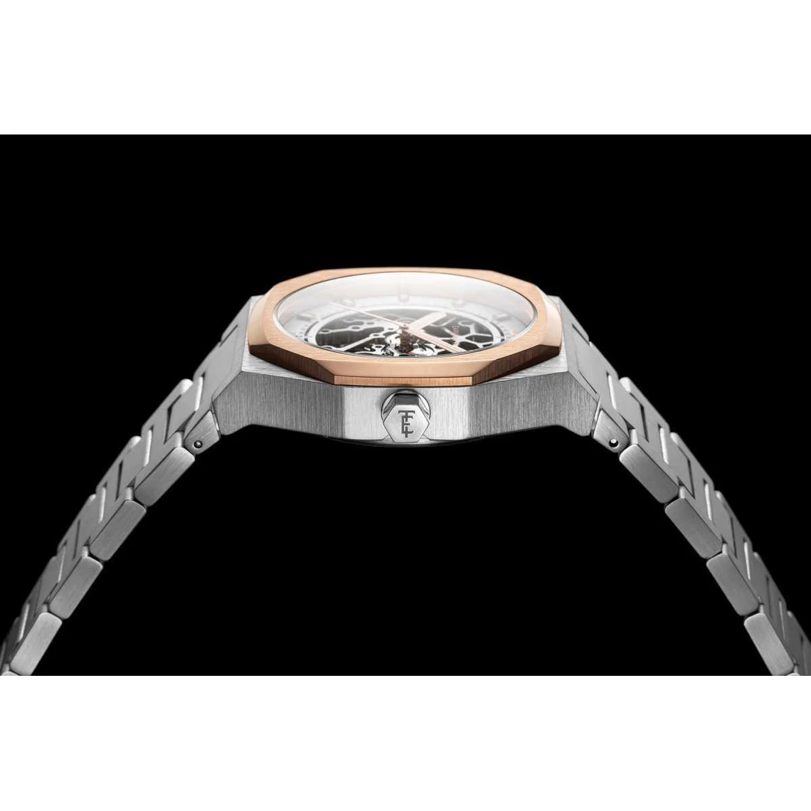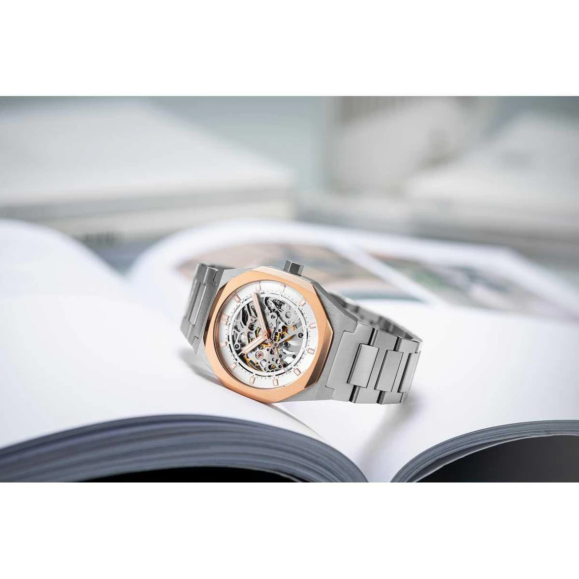 On apprécie le design bicolore et le style de cette Montre Homme EARNSHAW DRAKE – ES-8142-44 Bracelet Acier argent. Elle se distingue par la couleur dorée et la finition brossée de sa lunette, ainsi que l’originalité de son cadran squelette, laissant entrevoir son mécanisme automatique.