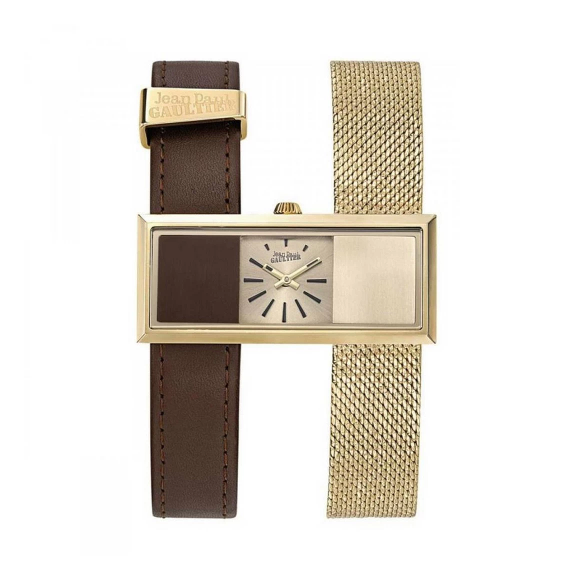Montre Jean-Paul Gaultier 8505014. Son design avec double bracelet lui donne toute son originalité. On retrouve un bracelet en cuir marron ainsi qu’un second bracelet en acier doré qui s’accorde au boîtier de la même couleur. Le cadran se distingue en trois teintes de couleurs pour une montre unique et sublime.