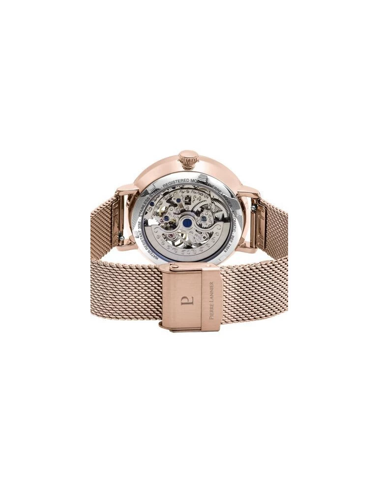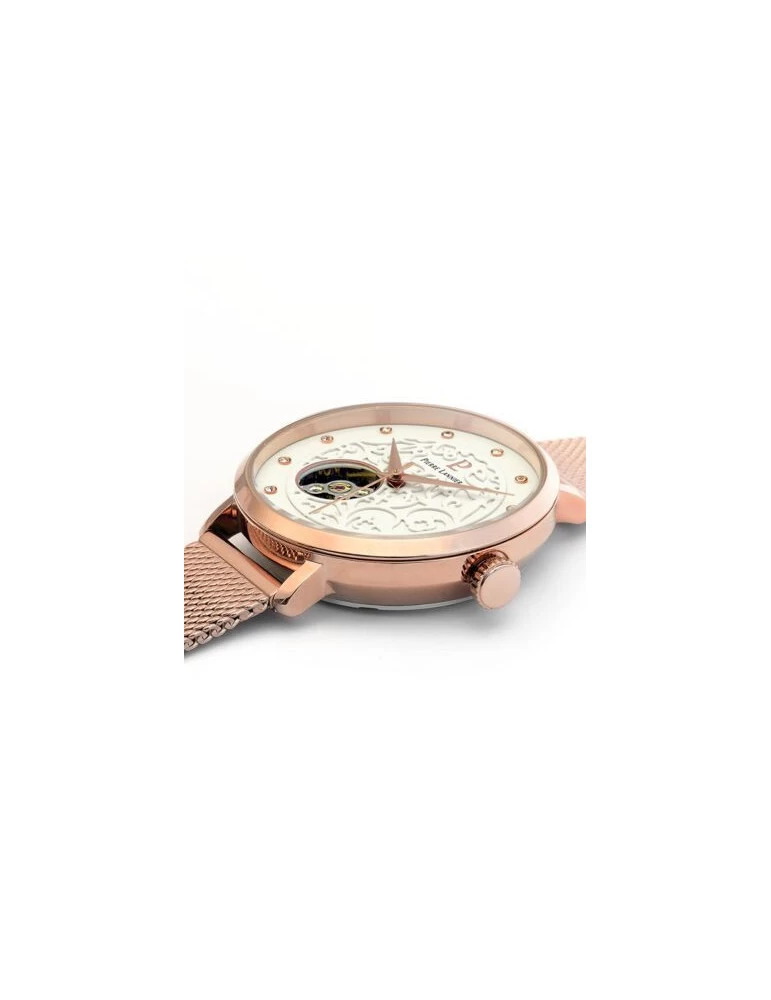 La montre est dotée d’un boîtier en acier inoxydable aux teintes doré-rose, son fond de cadran est orné de dentelles. Son bracelet de 16mm de largeur en maille milanaise aux tons doré-rose, s’adaptera parfaitement à chaque tour de poignet, grâce à son fermoir à coulisse. Taille du boîtier: 37mm.