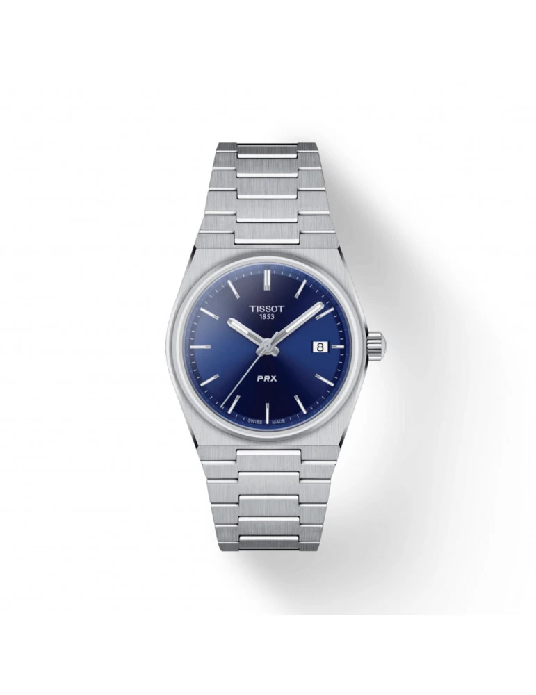Collection phare de Tissot, les PRX sont les meilleures ventes actuellement. Ici le modèle medium 35mm vendu pour homme petit poignet ou dame. Cadran bleu, verre saphir, bracelet à boucle déployante.